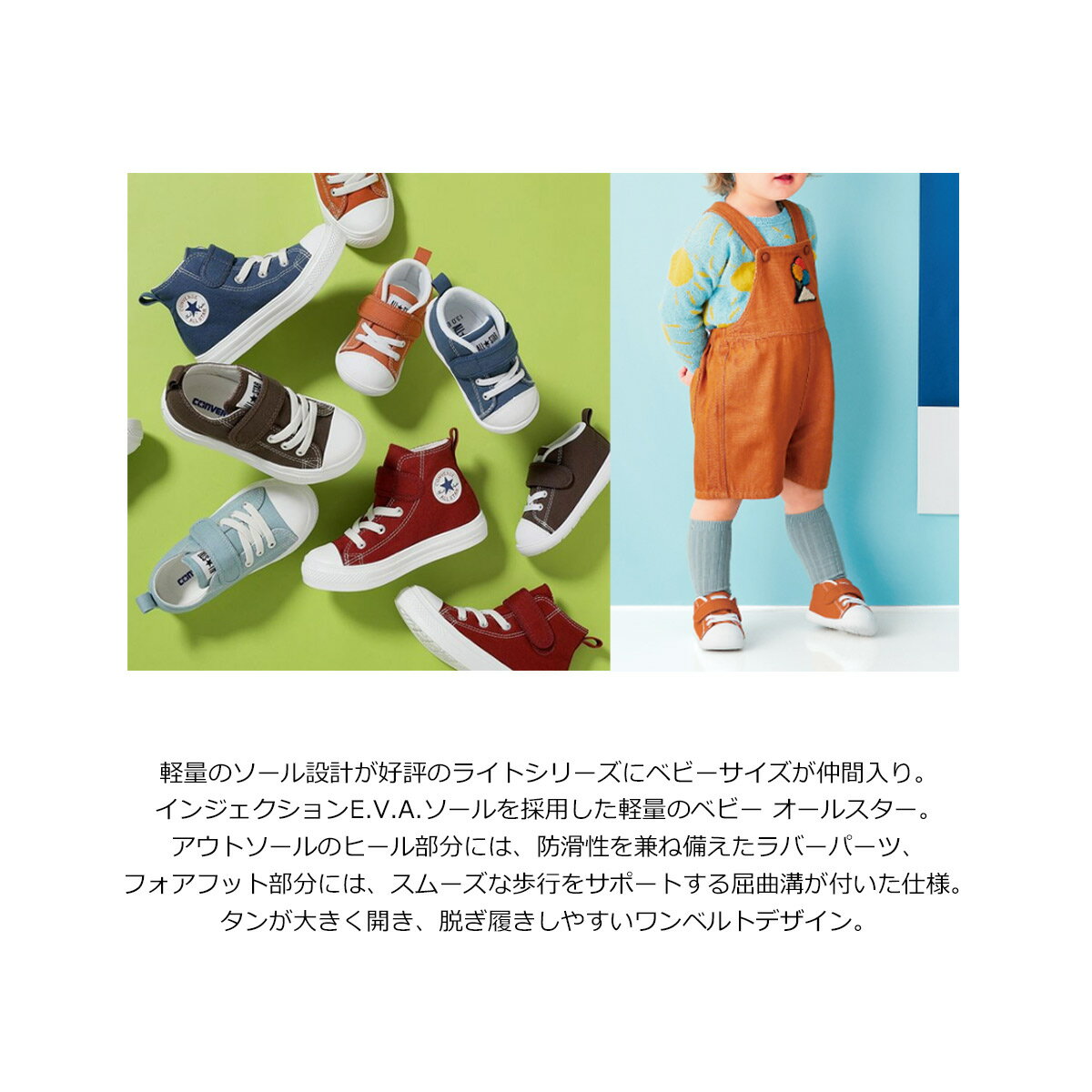 キーワード:ラウンドトゥ ローヒール フラット 紐 レースアップ ベロクロ クッション 快適 軽量 軽い 滑らない 柔らか 小さいサイズ 走れる 脱げない 痛くない 歩きやすい シンプル プレーン ベーシック アウトドア カジュアル スポーツ トラベル 旅行 ママコーデ レジャー 外遊び 保育園 幼稚園 親子 タウンスニーカー ブラウン 茶色 >> ページトップインジェクションEVAソールを採用した軽量のベビーオールスター歩き始めのベビーの足に優しい軽量かつ屈曲性の良いソール設計。