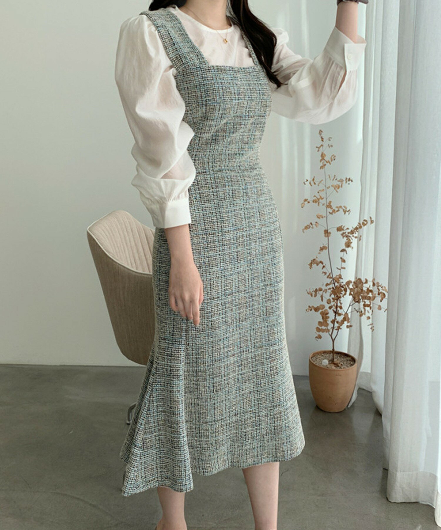 マーメイドワンピース ロング ワンピース ツイード 春 秋 スクエアネック 大人 キレカジ 綺麗め セクシー フリルワンピース タイト 綿混 ジャスミン 【マーメイドラインが綺麗なワンピース】