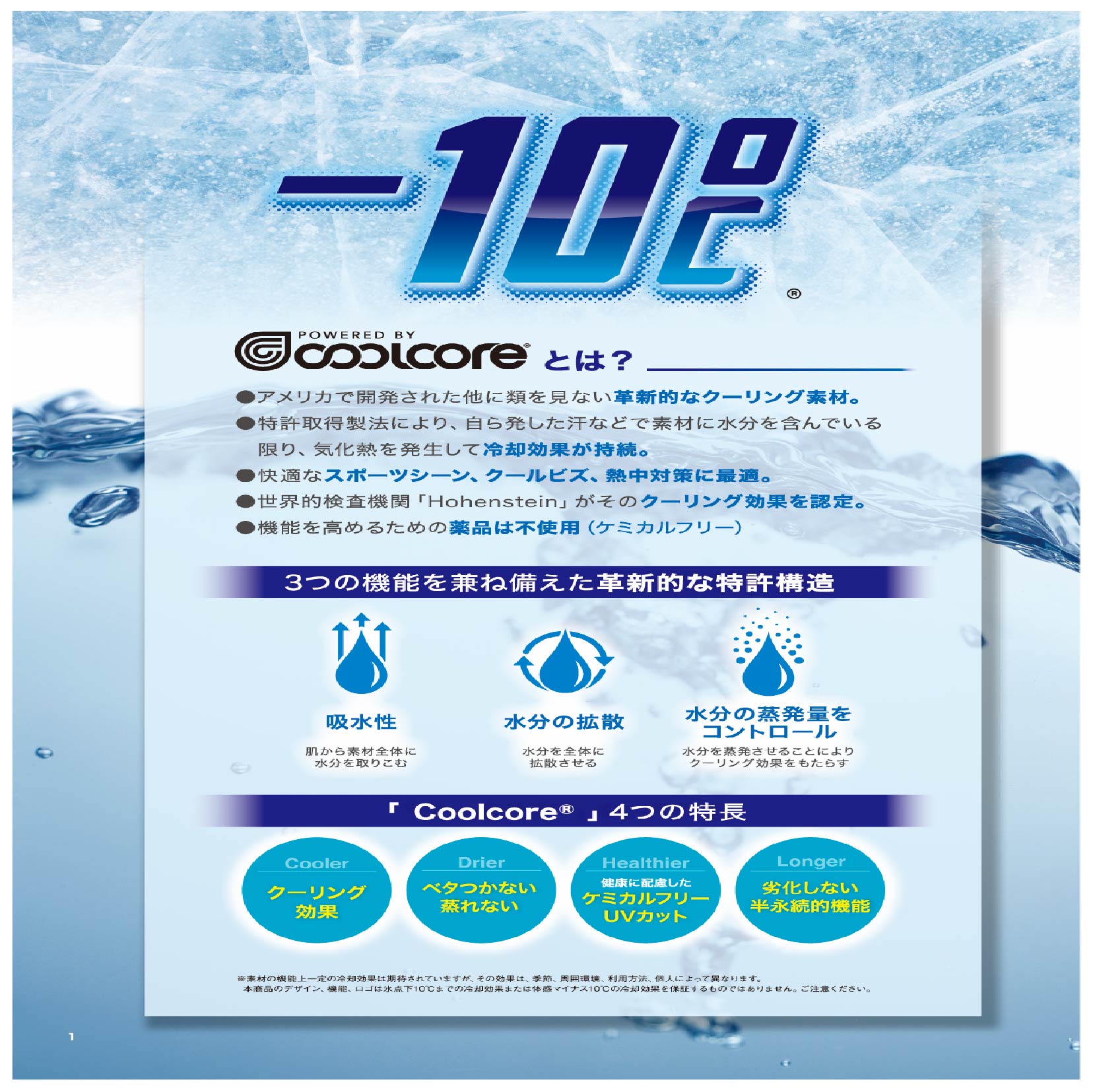 Coolcore(クールコア)|熱伝導性が高いゆえに冷たく感じるのはファーストタッチ だけの接触冷感とは異なり、「クールコア」は気化熱を利用し冷却するため、 水分がある限り、クーリング効果が持続されます。